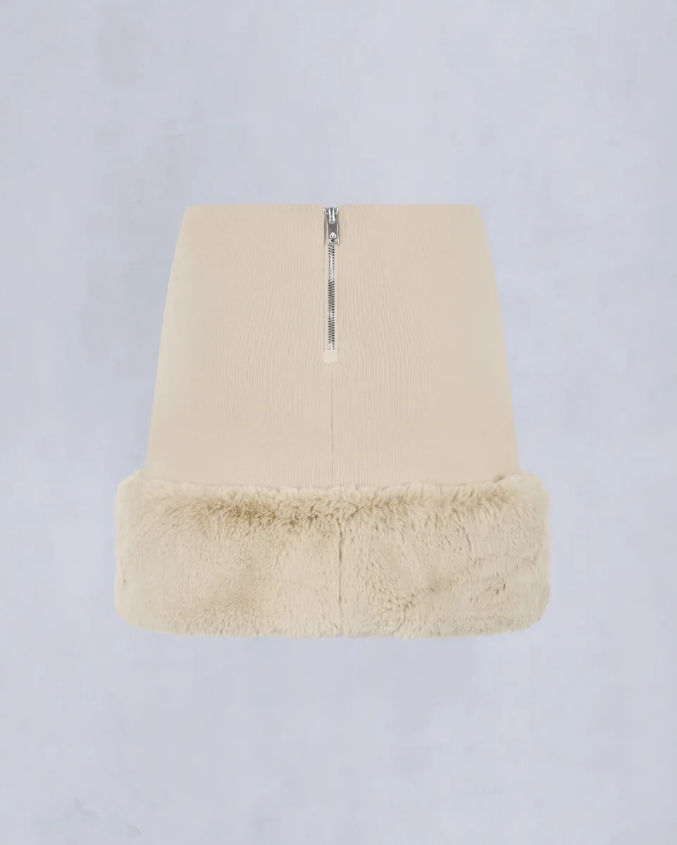 Ga voor speelse elegantie met onze mini-rok met pluche afwerking uit de Bunny-collectie, ontworpen om een vleugje eigenzinnigheid aan je garderobe toe te voegen. Omarm de perfecte mix van