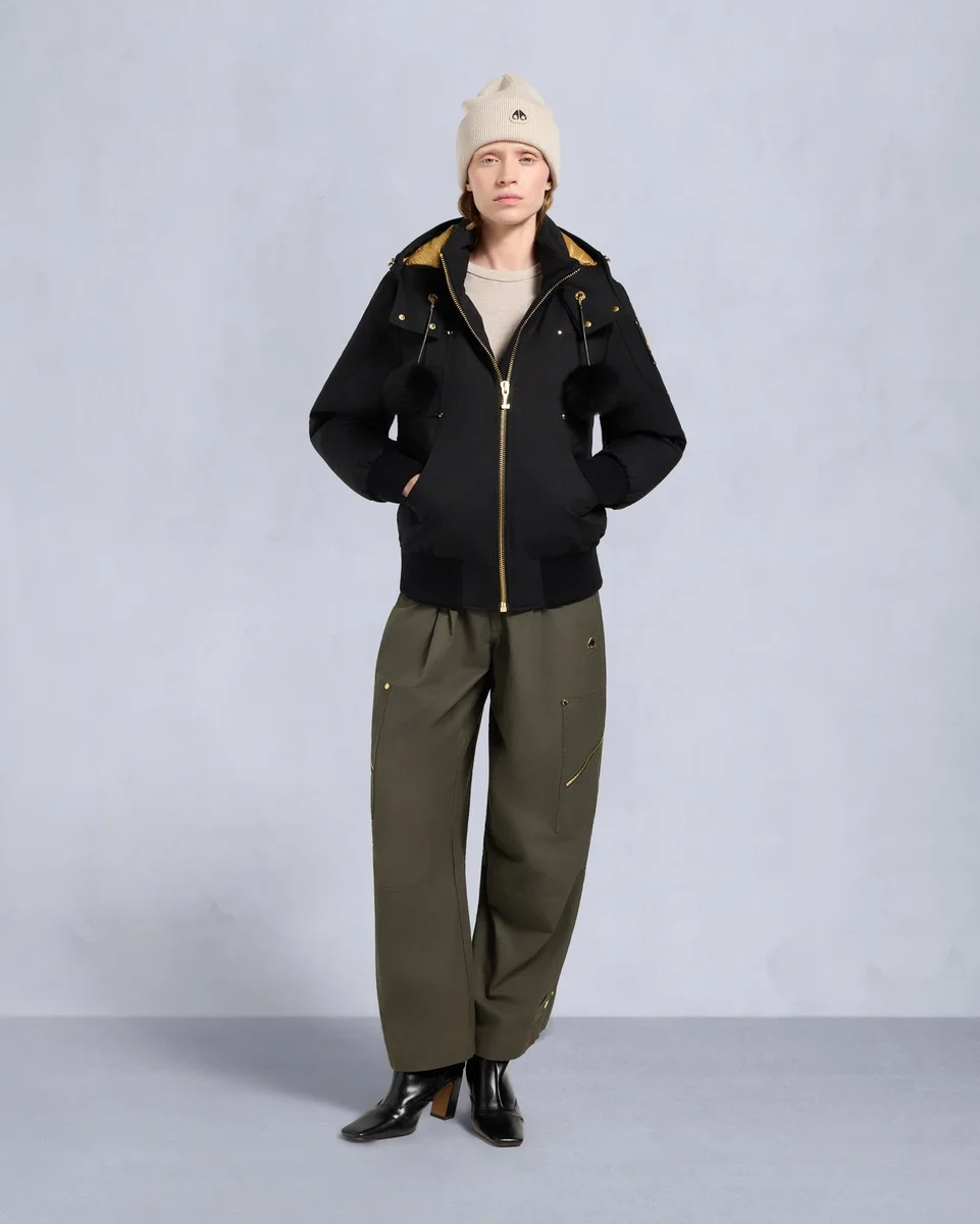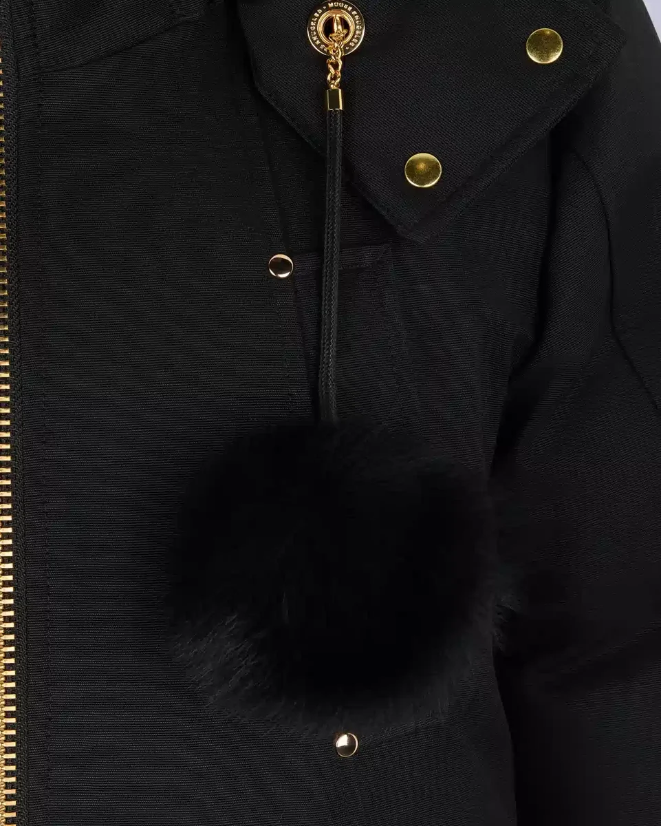 - Afneembare capuchon met afneembare schapenvachtrand en pompons