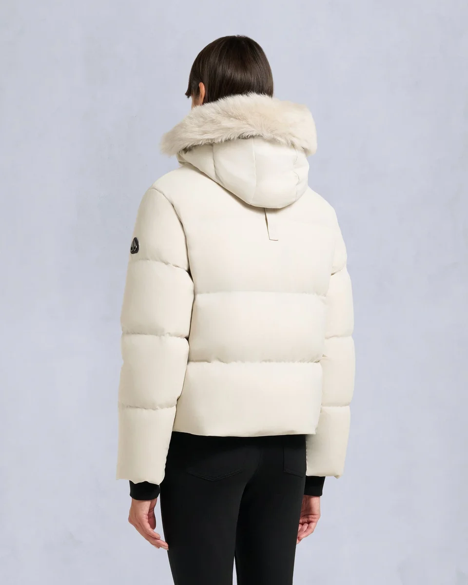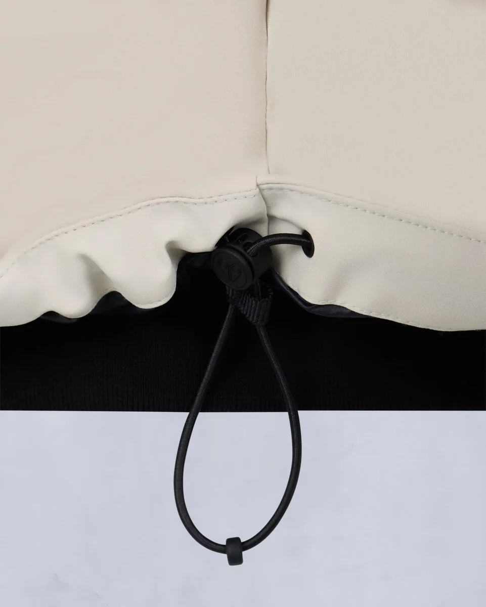Verwijder afneembare versieringen voordat u het kledingstuk reinigt. Binnenstebuiten chemisch reinigen – mild proces. Strijken op maximale temperatuur 110 °C – zonder stoom.