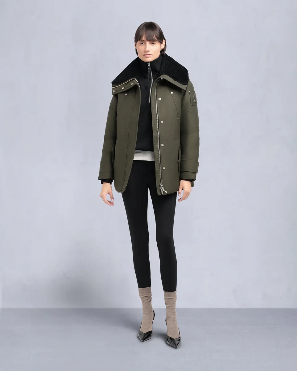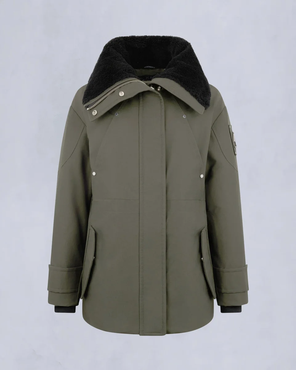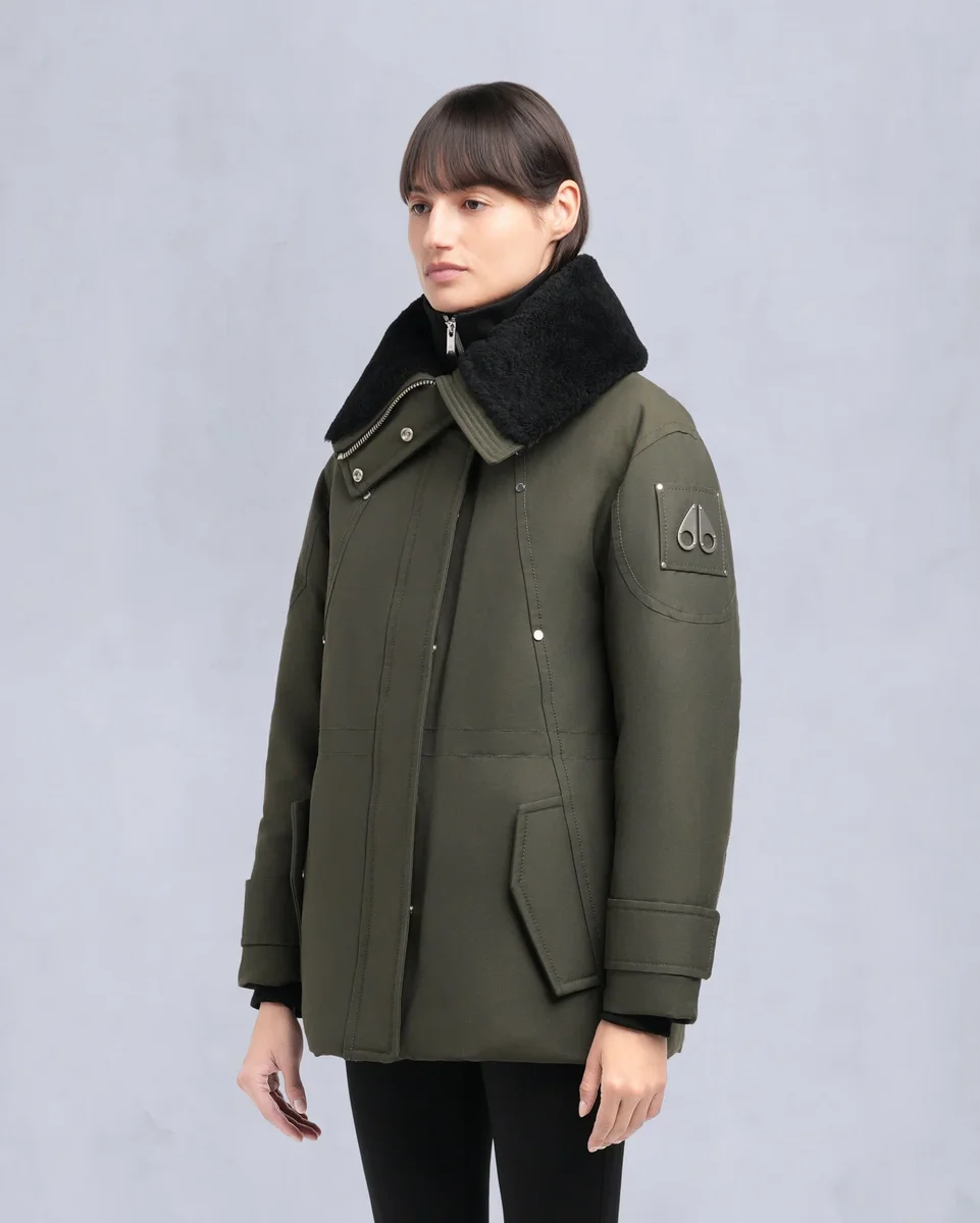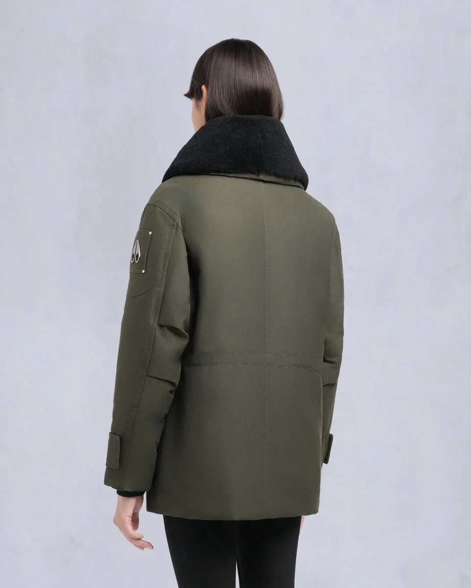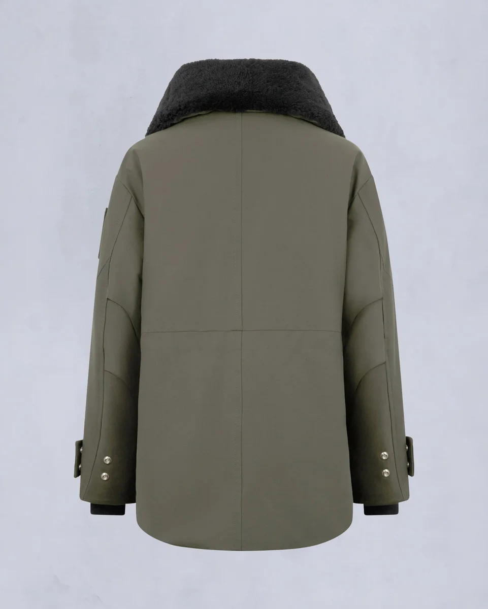 - Kraag gevoerd met gekrulde merinoschapenvacht