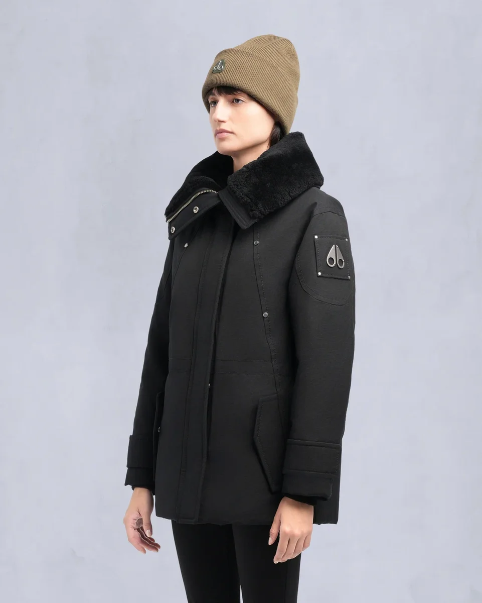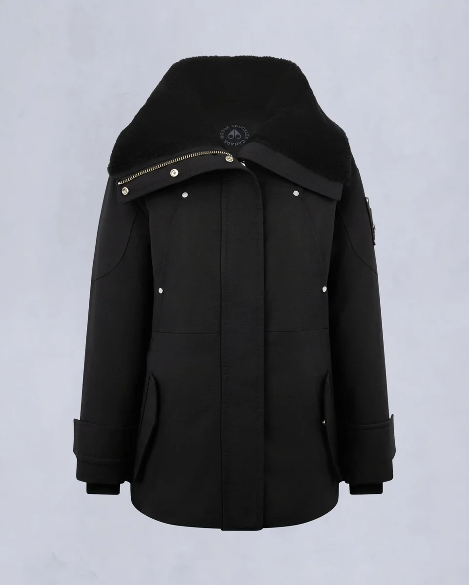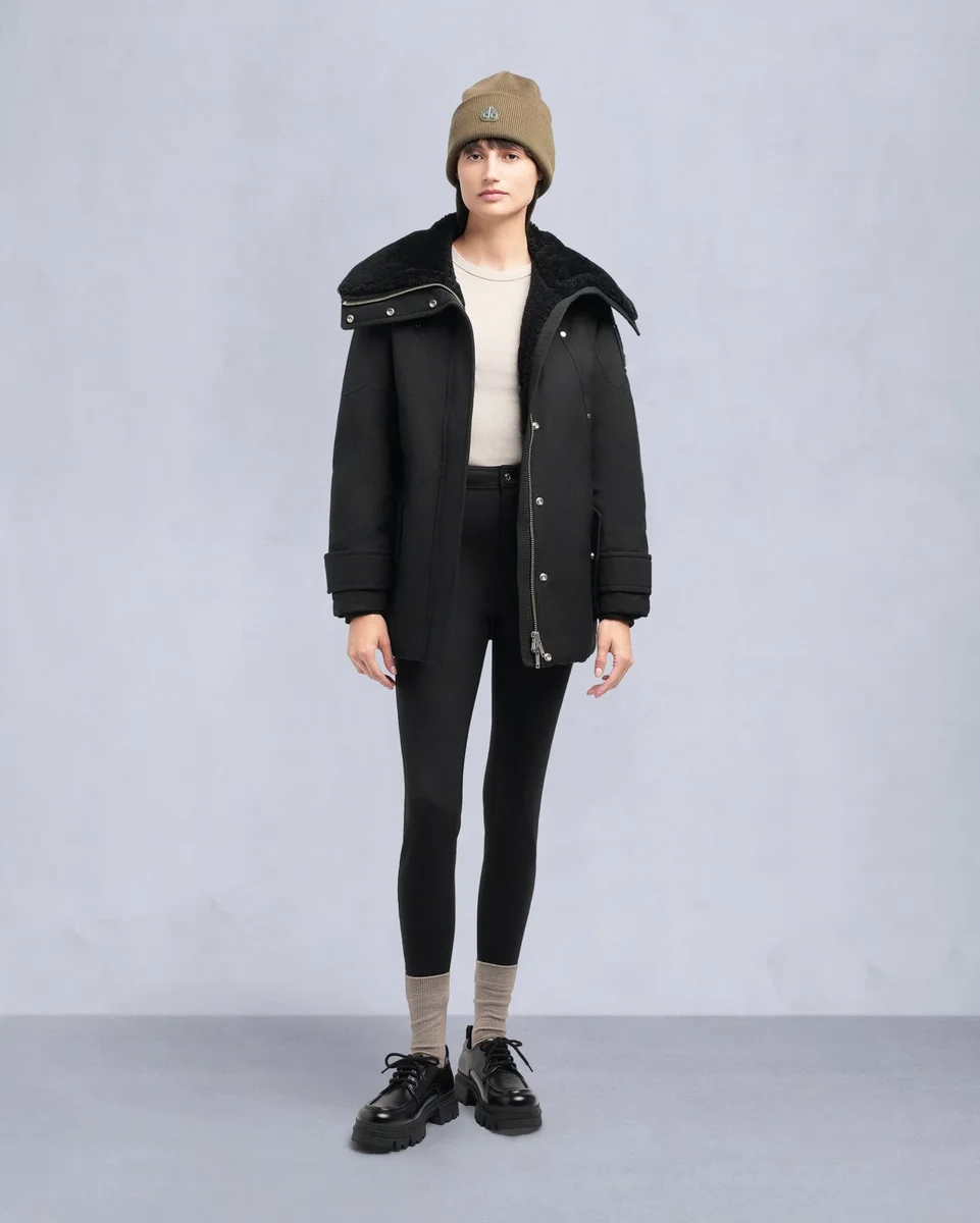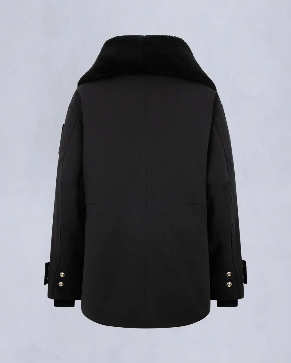 - Kraag gevoerd met gekrulde merinoschapenvacht