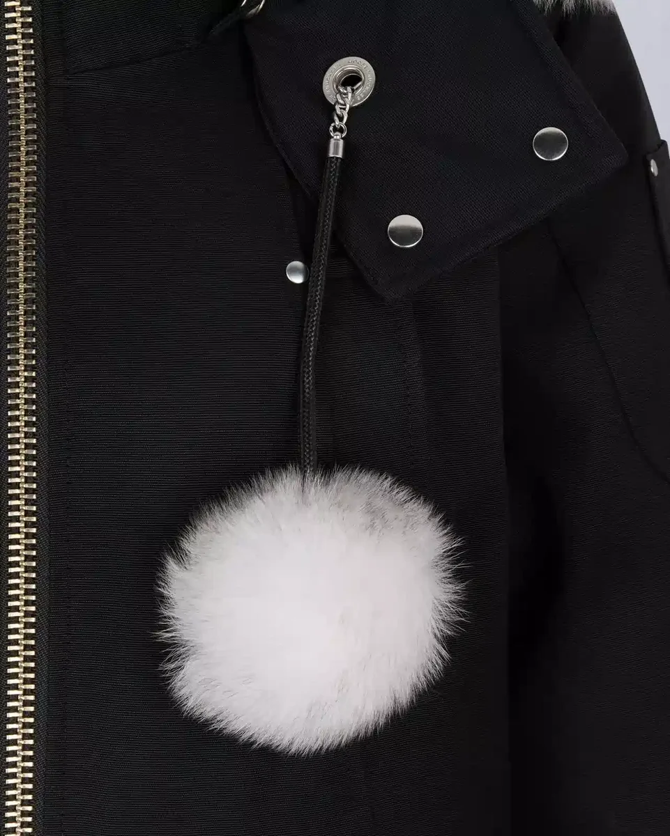• Afneembare capuchon met afneembare schapenvachtrand en pompons